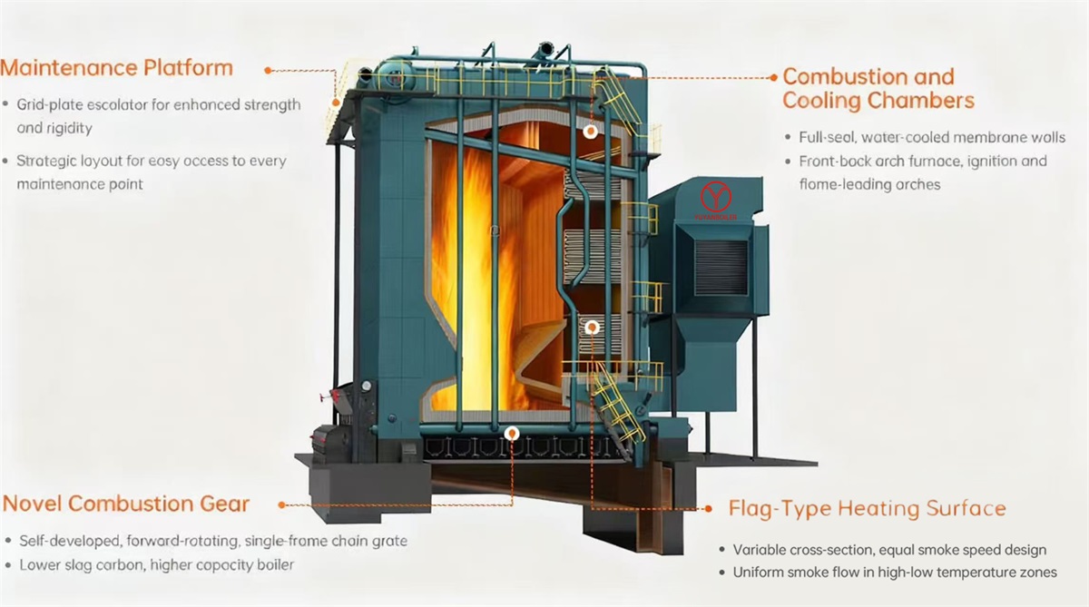 Cross-beam chain grate and membrane water-cooled wall ensure thorough fuel combustion