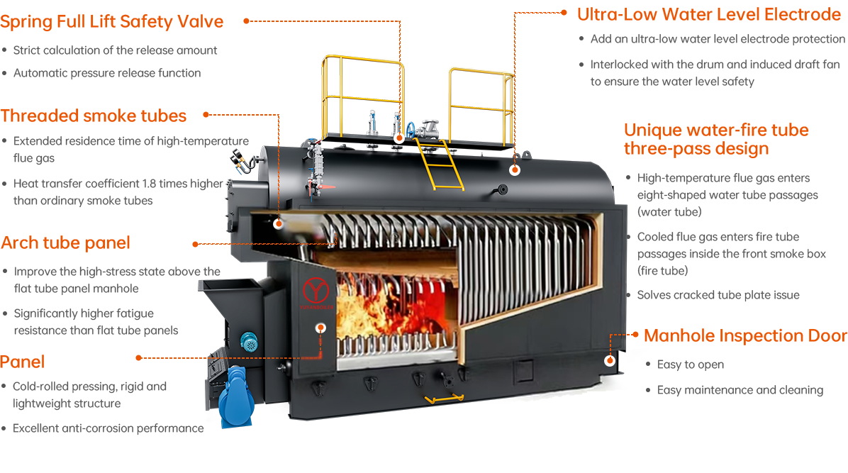 The DZL series quick-installed boiler is a horizontal three-pass water-fire tube chain grate boiler designed for bituminous coal combustion. The boiler features a single drum layout with threaded smoke tubes for convective heating surface, and water-cooled walls on both sides of the drum for radiant heating surface. The combustion equipment adopts a lightweight chain grate, and the boiler is delivered in a complete quick-installed form. The electrical control system enables infinitely variable control of the grate, with alarm and interlock protection for critical parameters.
