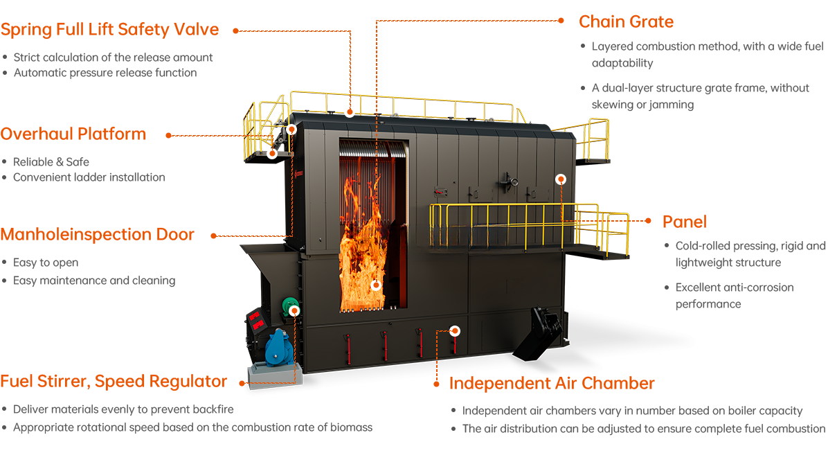 chain grate and independent air bin ensure thorough fuel combustion